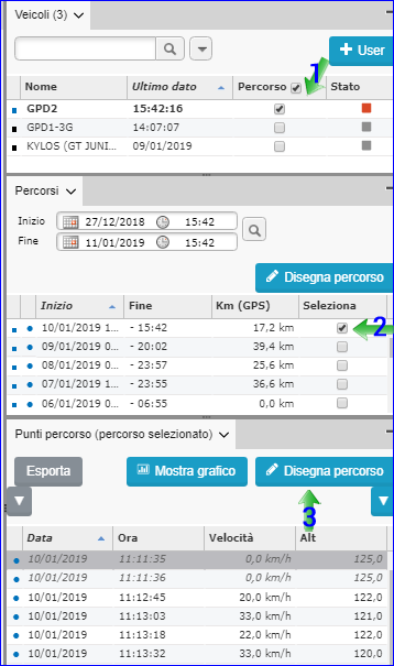 Spunta la casella "percorso" per il/i mezzo/i di interesse nel pannello Veicoli (1). Il sistema caricherà tutti i percorsi per l'intervallo di date presenti nei campi "Inizio" e "Fine" del pannello Percorsi. Seleziona, quindi, il o i percorsi desiderati (2) e clicca sul pulsante "Disegna percorso" (3) per visualizzarli sulla mappa.