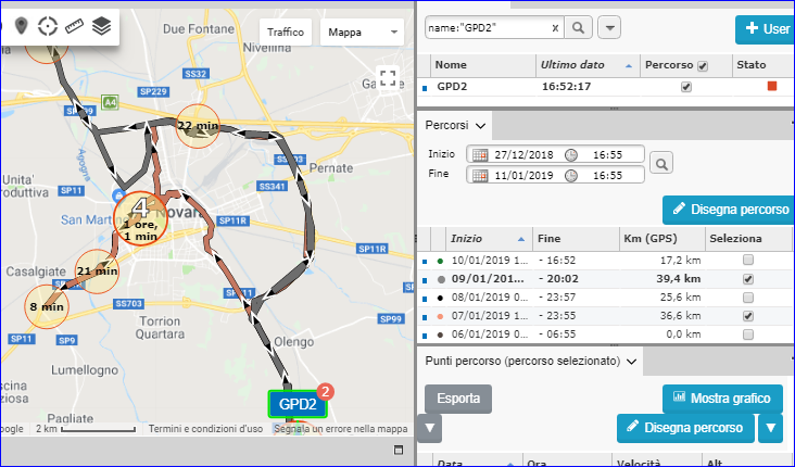 Se desideri cambiare l'intervallo di date, puoi farlo modificato i campi "Inizio" e "Fine" nel pannello Percorsi e cliccando sulla lente di ingrandimento per ricaricare i percorsi.