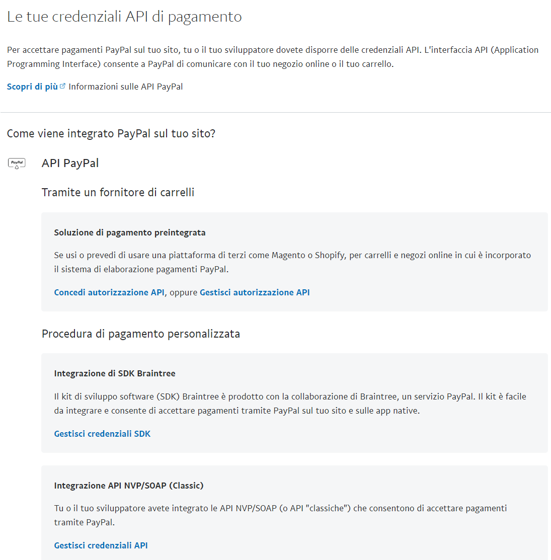 Una volta avuto accesso al proprio account paypal-business navigare fino alla seguente pagina ottenibile dal menù "Accesso API"